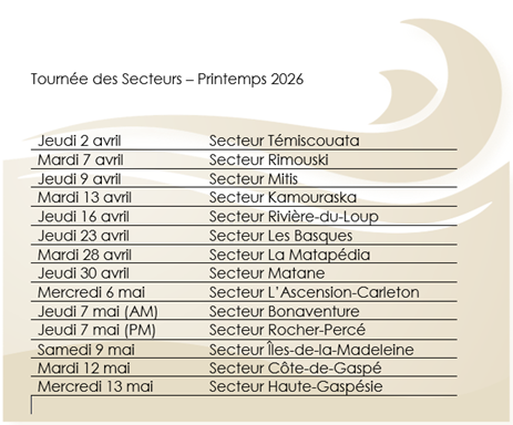Tournée 2026 - Ce printemps, le président, Monsieur Richard Rancourt, accompagné du Directeur général, Monsieur Harold LeBel, prévoient se rendre aux Assemblées générales annuelles (AGA) des 14 Secteurs.